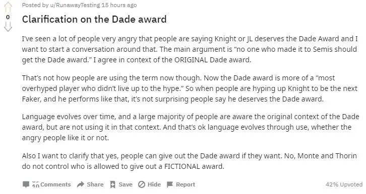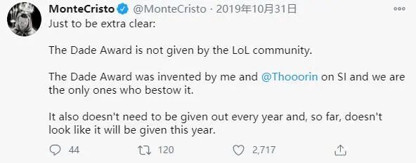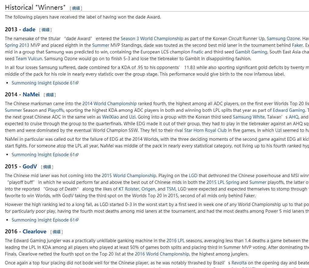 Ps:也有说法是奖项是S4推出的,S3是补发给了Dade,不过关于奖项的起源很多人并不关心,大家还是更关注每年会有哪些选手获得这些奖项。