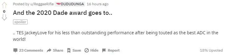 然后,被LCK观众寄予厚望的SSO倒在了小组赛,Dade更是被一众欧美法王轮番暴打,由拳头评选的职业选手排名成为了一个毒奶,一个笑话,在此之后,愤怒的OGN英文解说Monte Cristo更是推出了以Dade命名的“大帝奖”。