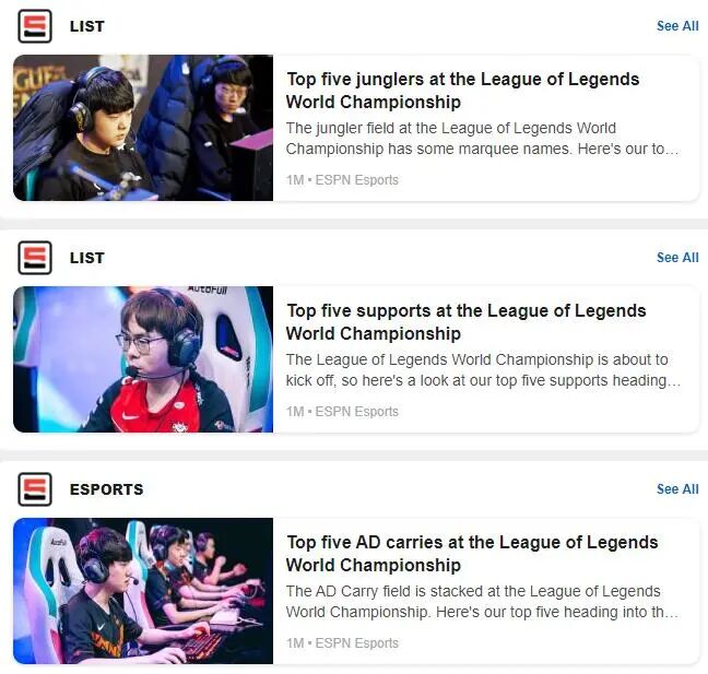 2016年,ESPN成立了电竞频道,正式踏足电竞圈,根据他们在NBA等赛事的管理经验,在转到电竞圈以后,也迅速推出了极具话题性的排行榜。相比拳头官方根据赛区解说制作的选手排行榜,ESPN虽然有些时候看起来不太靠谱,但是由于ESPN的知名度,以及ESPN排行榜的“毒性”,还是让许多网友十分关注ESPN的这个榜单。