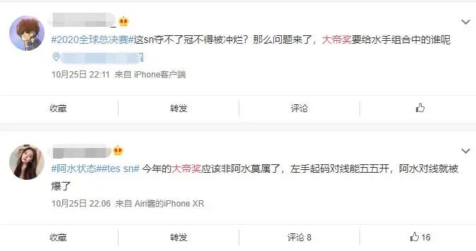 关于TES这两位选手的讨论非常之多,可以说无论是LPL的观众还是国外观众,他们都认为TES会是此次S10的夺冠大热门,正是因为这样,大家才会对从八强赛以后TES的表现深感失望。但是有人对于给TES选手提名大帝奖表示质疑,此前大帝奖获得者一般都是在小组赛被淘汰的战队里选,成绩最好也就16强,而TES已经打进4强了,对于一个第一次进世界赛的队伍而言这个成绩算是非常不错的了。