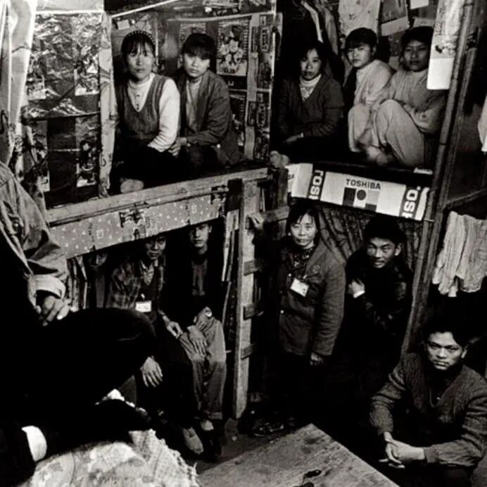 另一张照片则展示了他们的生活环境,在面积仅有7平方米的棚屋中,折叠着堆放了10张木板床。每个床位上都能住上两个人,一间屋子可以挤上将近20人。