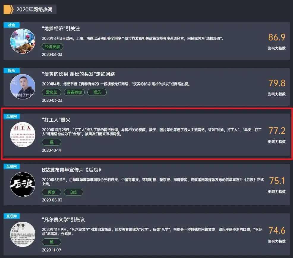 因为全民受教育水平的提高,他们或多或少地拥有一部分互联网的话语权。那些条件更为优渥,拥有更多空闲时间的群体,则成为新时代网民的主要组成部分。他们在网络追逐时事热点,玩着最新最潮的梗,比如“打工人”。