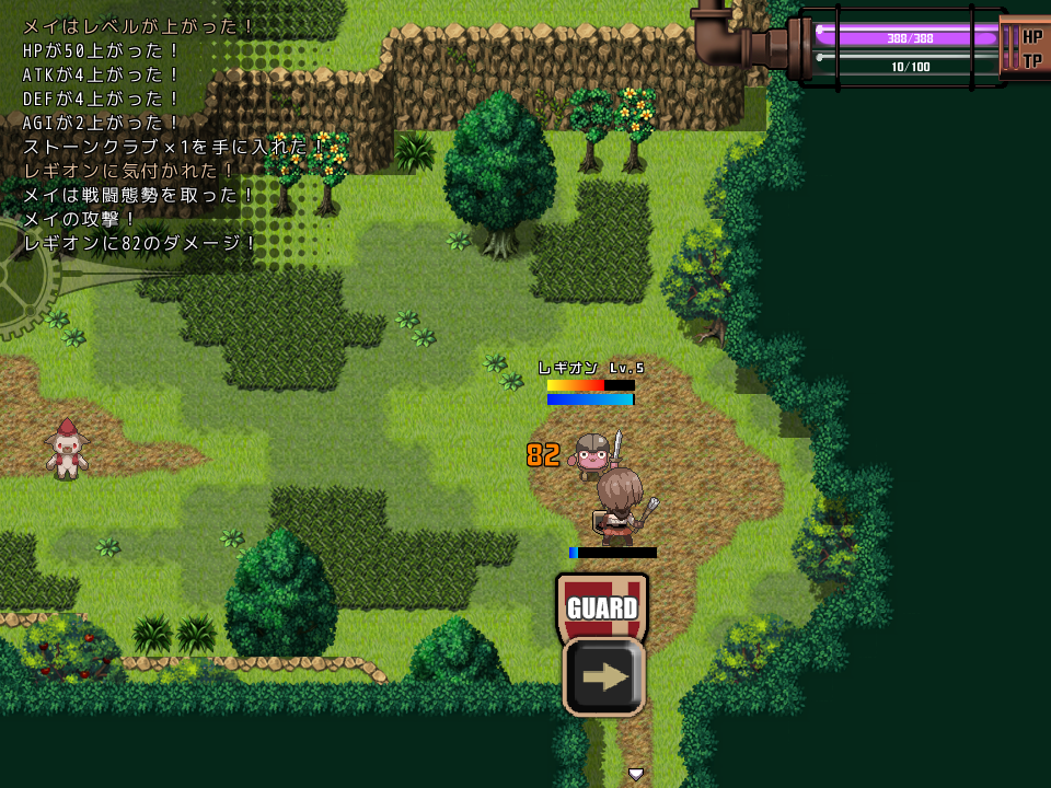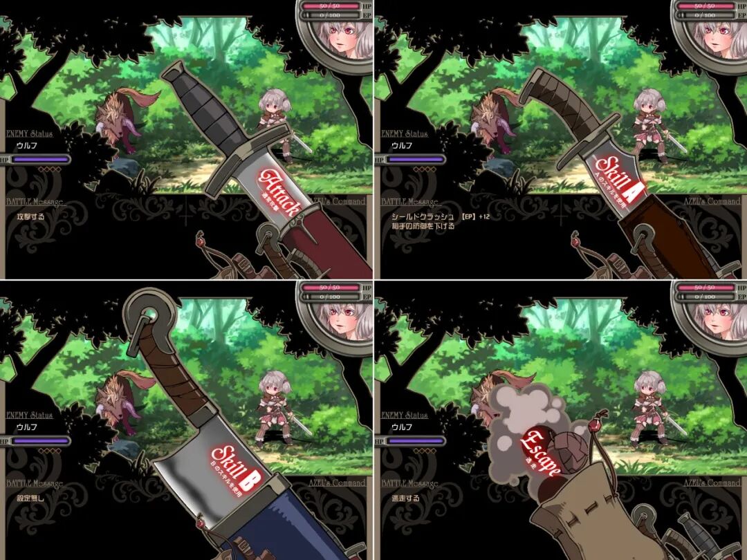 玩家在选择战斗命令时,它们分别被占画面比例很大的武器外观所代表,随着切换还有拔出和收起的动画,有着很强的第一人称视角游戏的代入感。这种UI在全天下伙伴加入来帮忙的少年向主流游戏很难见,因为画面中只有一个敌人和一个主角的位置,只有经常描绘成人式独行剧情的小黄油才有可能使用。