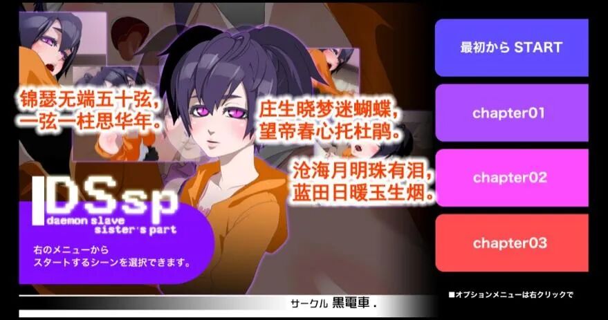 这个作品的官方定义甚至不是游戏(ゲーム)而是软件(ソフト),这是因为它本质就是用常见的GalGame工具制作的一本有声读物而已,用户甚至没有什么互动选择。但值得一提的是,虽然是处女作,此时黑电车的爱好和特长就已经非常明显——对于那什么的场面的描绘非常细致且狂野。