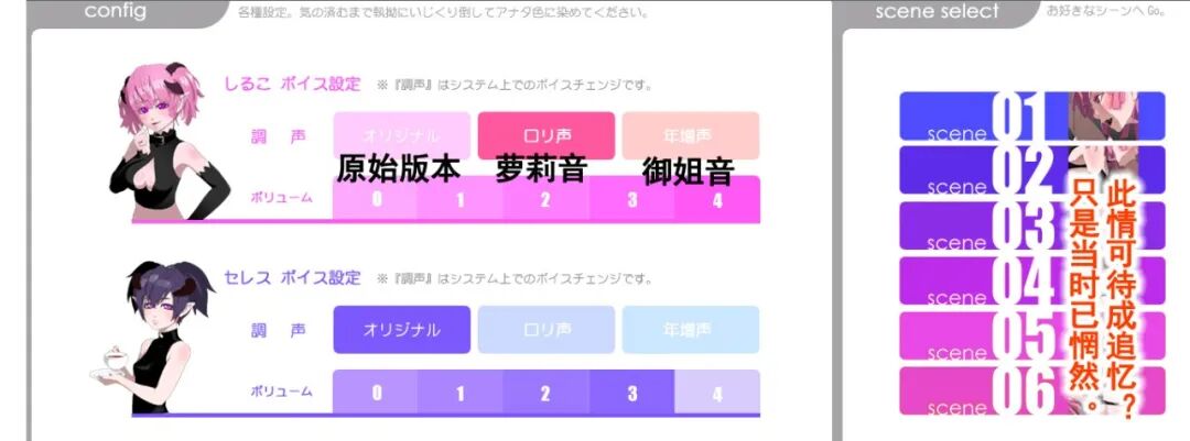 黑电车的作品从最初开始就几乎是全程语音,并且声优的实力足够到位,这对于很多还在苦哈哈用声优免费资源偶尔发出几句“呵呵哈嘿”的其他作品已经颇有些降维打击的感觉了,那么黑电车又是怎样“多迈一步”呢——支持玩家给女主选择不同的声线。