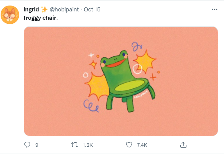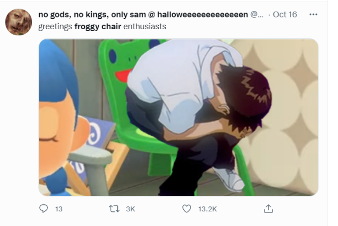 青蛙椅确实很受欢迎,在推特上,只要搜索“Froggy Chair”,你就能找到无数有趣的图片和二次创作。在动森2.0预告片发布后,创作更是迎来一次井喷。