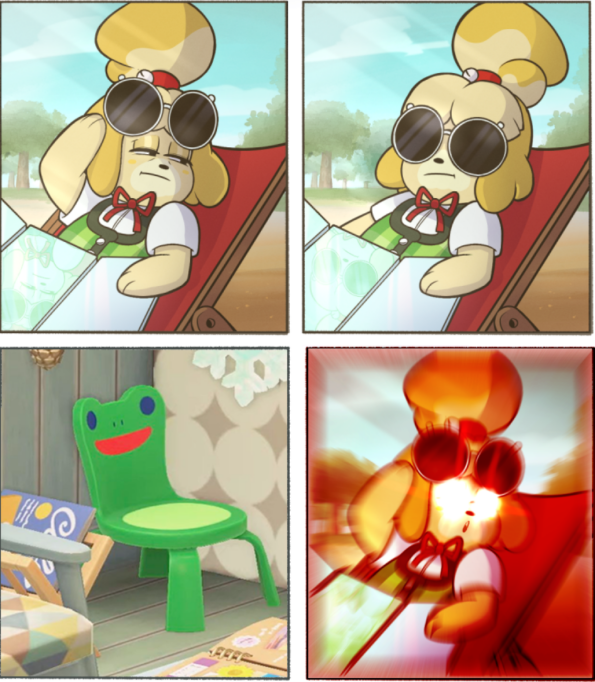 其实,就像大多数的Meme一样,我们很难用具体的语言去描述这把椅子在互联网上爆火的原因。但可以知道的是,虽然这个小东西在2012年发布的《来吧!动物森友会》中便有登场,但是数年以来,它都只是以一个普通家具的身份存在于游戏之中,直到2019年,发生了一件小小的事情: