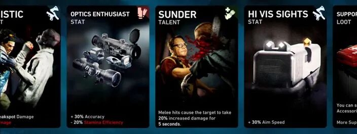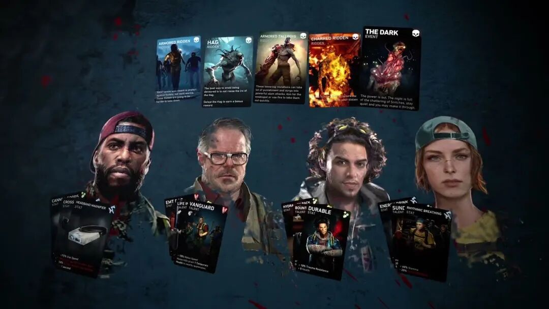 玩家可以从属性各不相同的增益卡牌中自选15张作为一套卡组开始游戏,配合不同角色的角色特性有针对性地携带不同卡组可以玩出花样的build,比如其中有一个“老妈”角色,自带1个额外的回血道具的堆叠数,可以瞬间拉起倒地的队友还能提供给整个小队额外的血量,非常适合携带一套治疗增益的卡组,作为一个奶妈来玩;又比如“伊凡杰洛”,他自带加速耐力回复的被动,因为近战攻击消耗耐力,所以就可以多带一些近战相关的卡牌,让他用近战武器大杀四方。