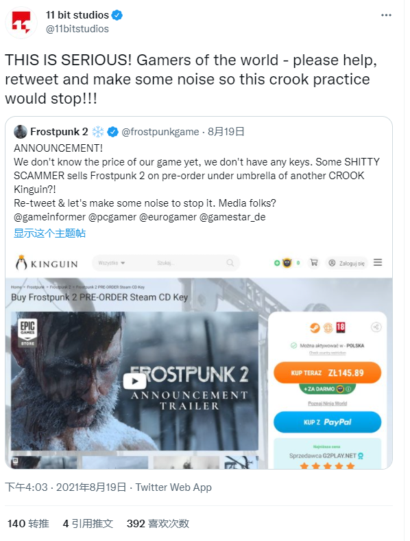8月19日,《冰汽时代 2》开发商11 bit工作室在推特上“大发雷霆”,矛头直指CDkey销售平台Kinguin。这家平台在《冰汽时代2》刚刚公布两周,还处在开发阶段时,便对这游戏进行了一波虚空预售。