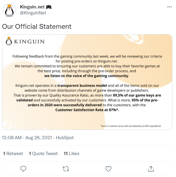 一周之后,8月26日,Kinguin不紧不慢地在推特上发布了针对这件事情的声明。在声明中,他们仅仅用一句“将会审视和改进发布预售商品的标准”做了解释,大部分篇幅都是用来辩解其平台的合理、合法性。