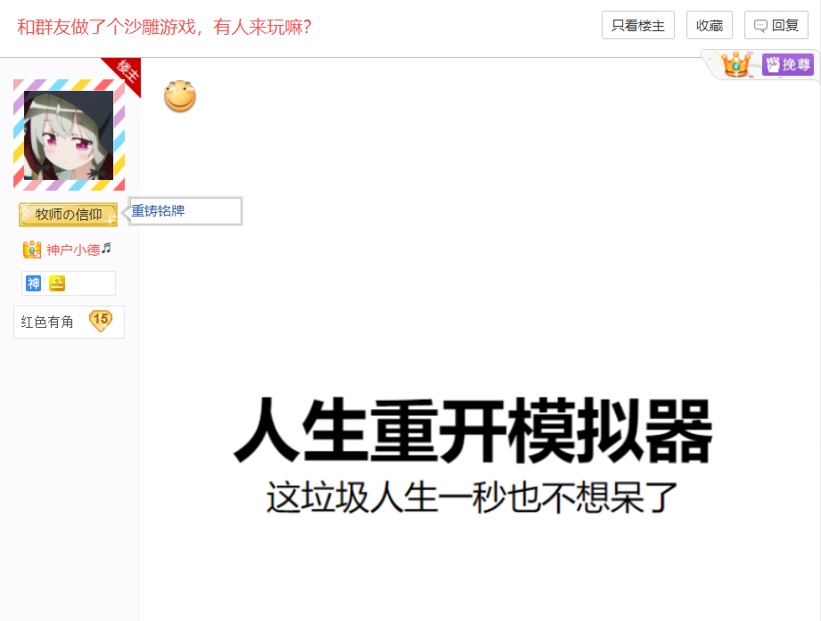 9月3日,星期五,一个普普通通的清晨,神户小德在Bilibili吧发布了自己和群友们共同创作的《人生重开模拟器》。或许是发布的时间太早,大部分人都还在睡梦之中,这个帖子一开始并没有得到多少人的注意,用了将近一个半小时,回复才填满了一页。