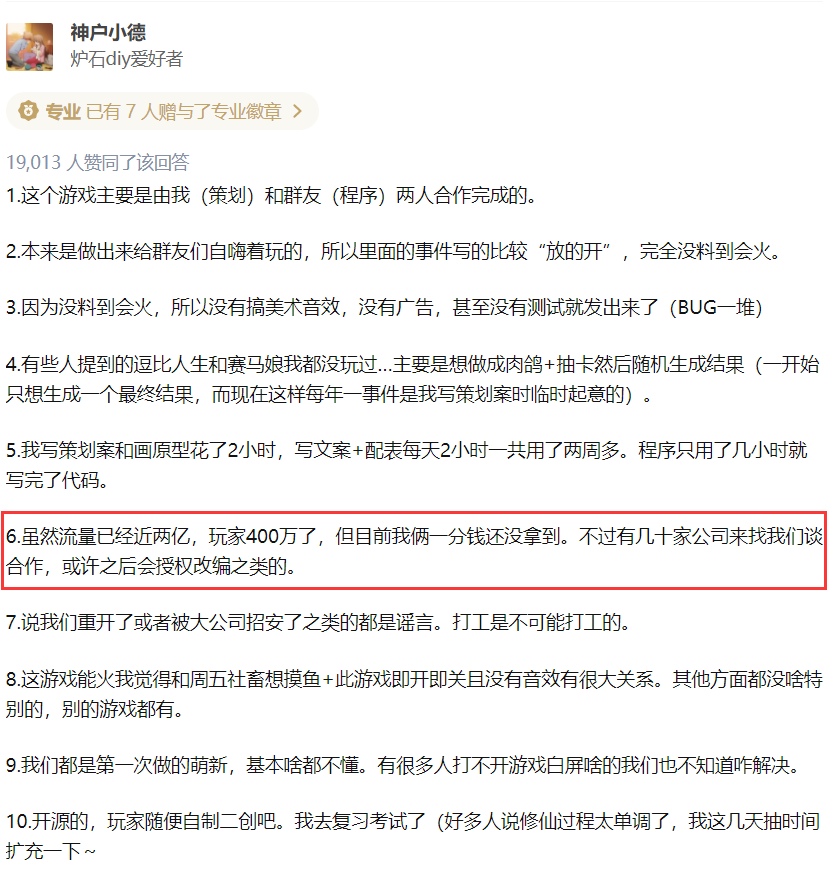 《人生重开模拟器》的成功不是偶然的,可以说是两位开发者厚积薄发和群友们的集思广益所带来的结果。但是,《人生重开模拟器》的爆红,在给他们带来喜悦的同时,也带来了不少的困扰。