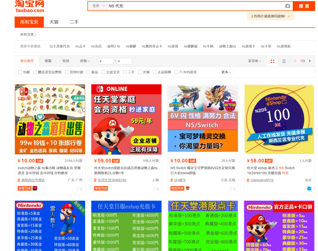 搜索“NS代充”等关键词,会有很多相关店铺出现,购买此项服务的人也不在少数