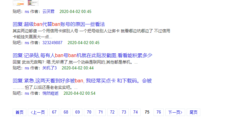 按时间倒序,在NS吧搜索“ban”,能显示75页的相关帖子