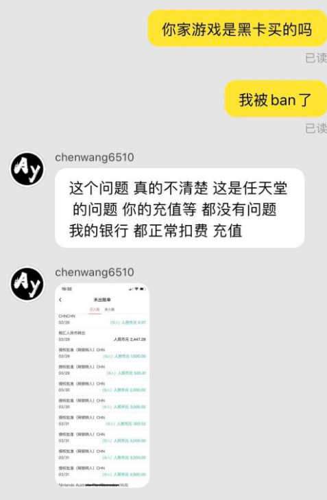 巧合多了就不是巧合了。在摸清了源头之后,他们集体去找了客服,但得到的回复却不尽人意。这家淘宝店仅提供扣款功能,表示店内有按要求充值。至于NS为什么会被超级ban,他们将锅甩给了任天堂。