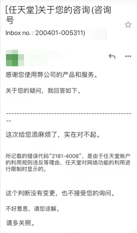 无奈之下,这群被超级ban的玩家只能发邮件,向任天堂申述回自己的NS。但由于任天堂在账户使用条约中表明不承担此事责任,因而他们的申述自然也是落败了。