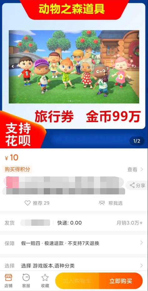 《集合啦!动物森友会》本该是款“休闲养老”游戏,然而似乎还是有不少人希望氪氪金让自己“更强”,于是就有商家满足这些人的喜好。可怕的是,当我进入淘宝界面时,发现这项交易“月销3万+”。