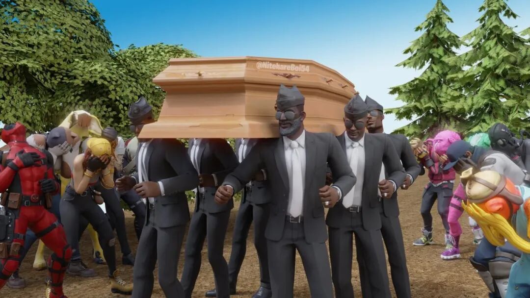 此外,在《堡垒之夜》中整的活也颇有意思:抬着棺木的几位黑人跳着欢快的舞步,而其他人则是掩面哭泣...