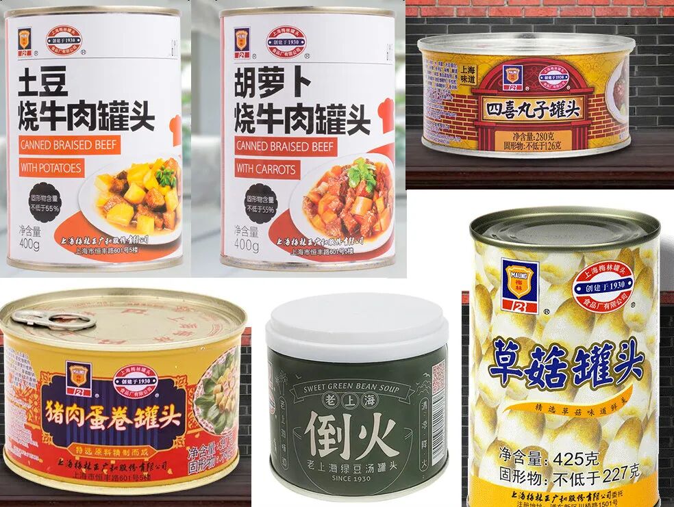 比如论种类覆盖,那简直是地毯式轰炸。你要小餐荤菜,来个四喜丸子;你想加点花样,来个猪肉蛋卷;经典储藏系,来个草菇罐头,连开罐方式都是古典派需要起子,情怀自带;午餐肉不给力想加点料?那就强化型MK2火腿罐头;想要一顿饭荤素搭配轻松解决?土豆烧牛肉罐头和胡萝卜烧牛肉罐头双子降临;还有前述的茄汁黄豆,素菜怎么能少;天热了上火?连绿豆汤都有;需要主食也有各种尺寸符合不同人群的八宝饭,至于其他什么扣肉、排骨、清蒸做法随便选,有的是!
