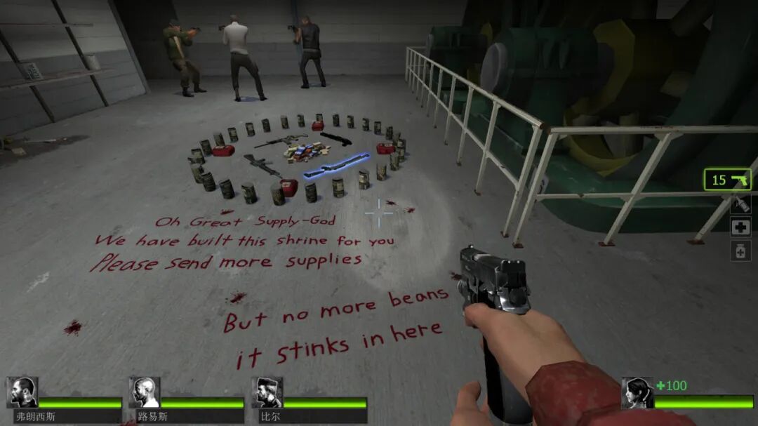 下图比较恶趣味的体现了曾经在安全屋的人无法忍受豆子罐头的痛苦,红字大意:“伟大的补给之神,我们为您建立了这个祭坛,请赐予我们新的补给品……但请不要给豆子罐头,它们太腥了。”