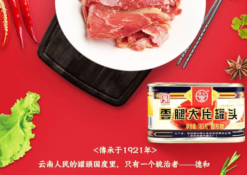 既然菜师傅发挥重庆美食特色,那么云南品牌也不能轻视同行,必须掏出云南招牌必杀技云南火腿了。没错,云南的老字号德和的肉罐头都是带了云腿BUFF的,除了午餐肉里加了云腿味道极其特异美味之外,还有专门的大片云腿罐头,只此一家,不要不服。