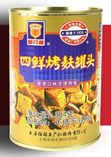 量不虚,质更强,梅林独门绝学的四鲜烤麸一直是罐头大家族里的素食明星,和兄弟油焖笋共同占据饭桌多年,直接吃也罢,二次烹饪也罢,罐头系食谱里膳食纤维的主力,是真正的“可以吃一年”级别。