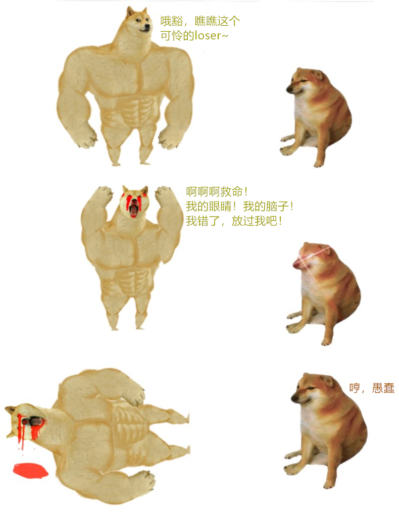 对于这个梗图来说,肌肉Doge代表最理想化、最强势的状态,而另一只面露忧愁的狗则代表着最为现实,或是最惨淡的状态。当二者摆放在一起,视觉效果与文字的冲击自然不言而喻。