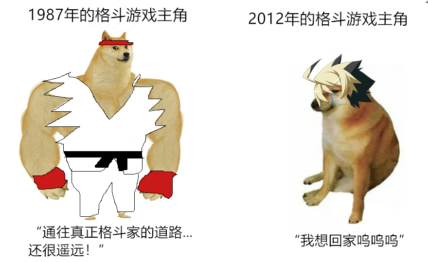 1987年《街头霸王》的隆,拥有着健硕的肌肉,倒三角的身材,将这样一套衣服画在肌肉狗身上也无太大违和感。但相比2012年《夜下降生》的灰都,就显得十分瘦弱。明明大家都是格斗游戏的主角,为什么....