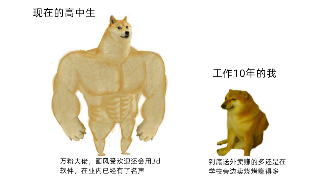 就像下图这样,还未进入大学生活的高中生,在微博上却是万粉的绘画大佬,甚至在业内有了一定的名声;反观已经当了10年社畜的自己,却在思考送外卖赚的多还是在学校旁卖烧烤赚的多。
