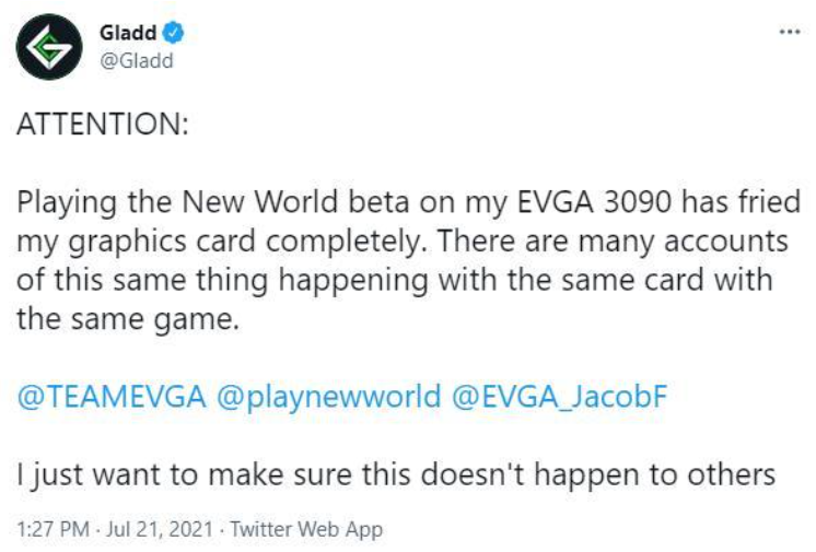 在今年7月份《新世界》进行B测的时候,就有包括著名Twitch主播Gladd在内的不少玩家反映称:在运行这款游戏时,他们的EVGA RTX 3090显卡风扇速度突然上升到100%,紧接着过热并变砖。