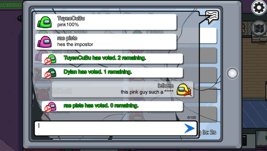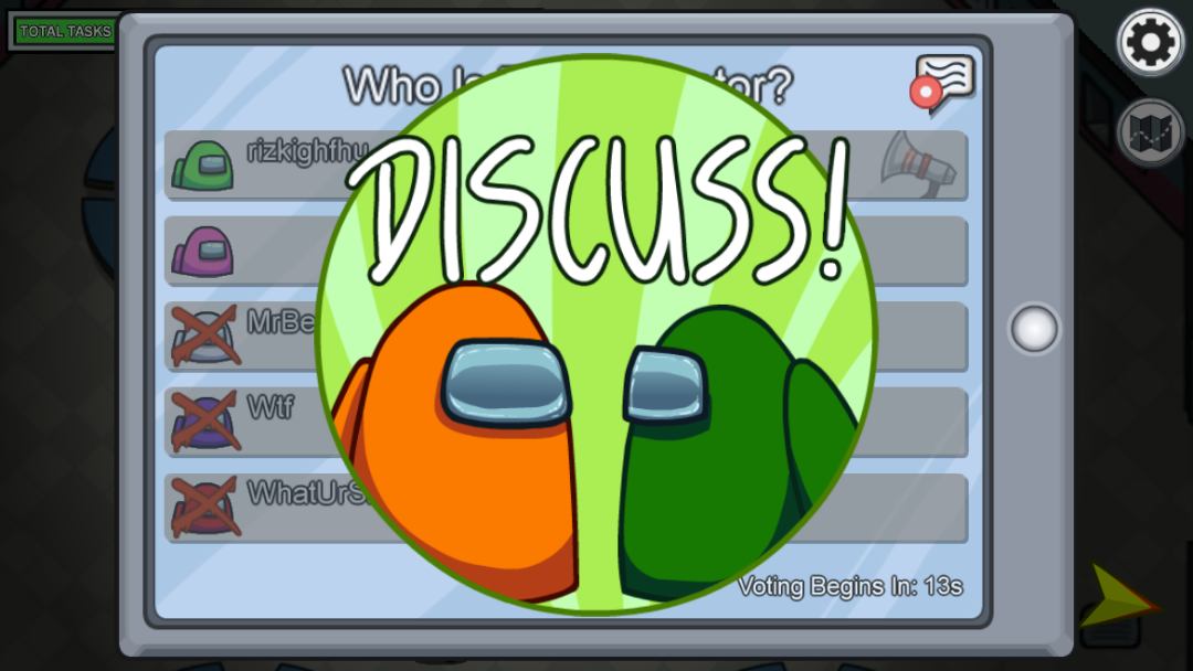 当击杀完成,正常玩家发现一具尸体时,所有人都会聚在一起开会,讨论他们在过去几分钟内目睹的可疑行为。在这些会议中,有嫌疑的冒名者可以被投票排除在外,但如果冒名者的演技足够精湛,反过来栽赃那些无辜的普通玩家,造成团队内部互相猜忌,甚至误杀,从而将团队缩减为一个危险的小团体,这使得剩下的玩家在暗杀者面前更加脆弱。