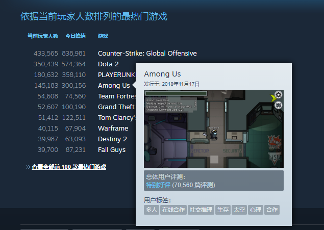 《Among Us》这几个月火得有些没道理。你很难想象一个画面简陋成这样的游戏,连续几周Steam销量达到周榜前五的位置,Steam同时在线人数超过19万人,仅此于《CSGO》、《Dota 2》和《PUBG》。