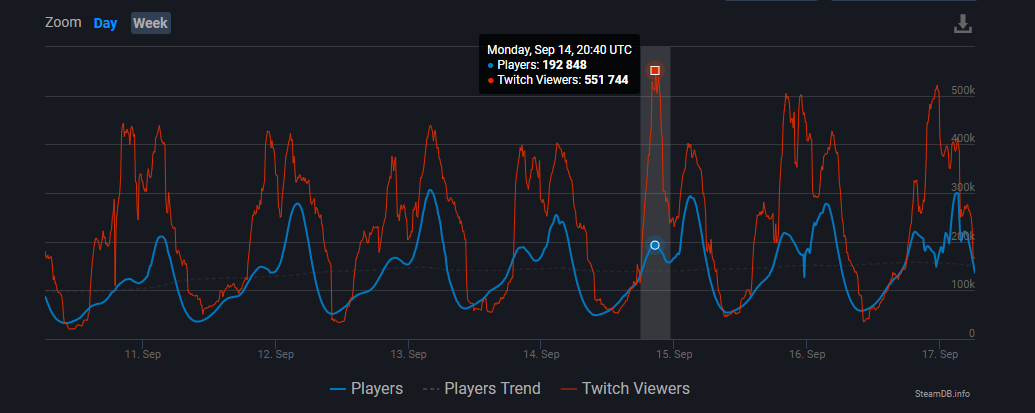 根据SteamDB的数据,本月14日《Among Us》PC版的同时游玩玩家数有192848人,Twitch直播观众则达到了551744人