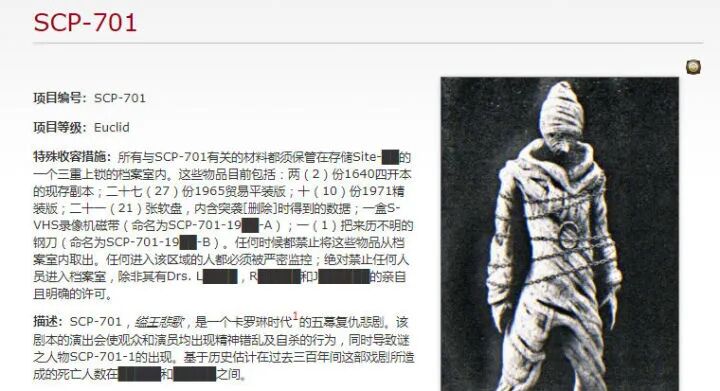 SCP项目的档案会显示等级、特殊收容措施和具体描述,基本思路和4chan那篇最早的贴子是一脉相承的。