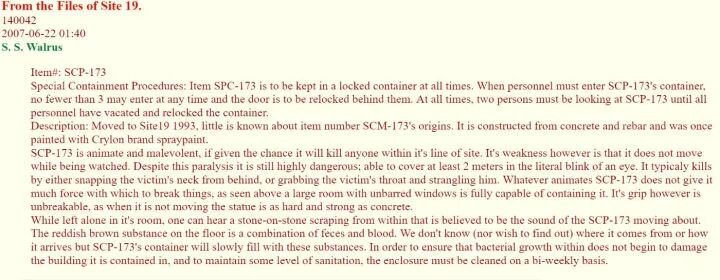 在他的描述中,SCP-173是一个由螺纹钢、混凝土及喷漆组成的雕像,具有敌意。它在没有受到直接眼光注视的情况下,会高速移动到人的背后,折断人的头颈,致人死亡。