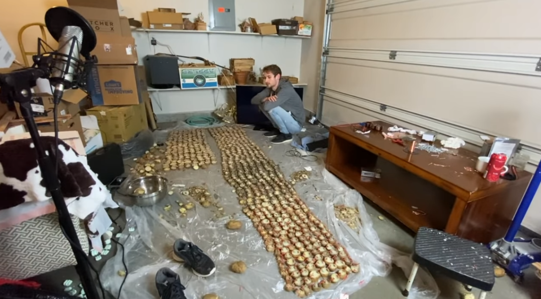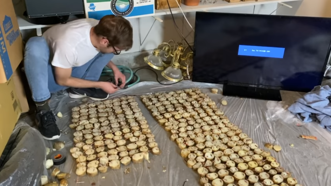 首先要确定设备所需的电力。Equalo相中了一款掌上电脑,树莓派Zero,要让它运行需要提供100-120毫安、5伏特的电力。但是一颗土豆能提供的电力非常低,为此Equalo购买了大量的土豆,并且将他们一一煮熟切开,并且用线路连接起来。