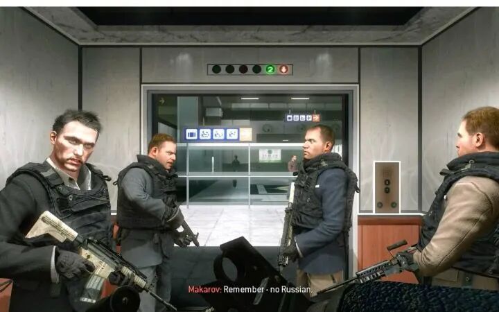“No Russian”中玩家扮演的是为了潜伏被迫参与施暴的艾伦(并且玩家可以选择不开枪)