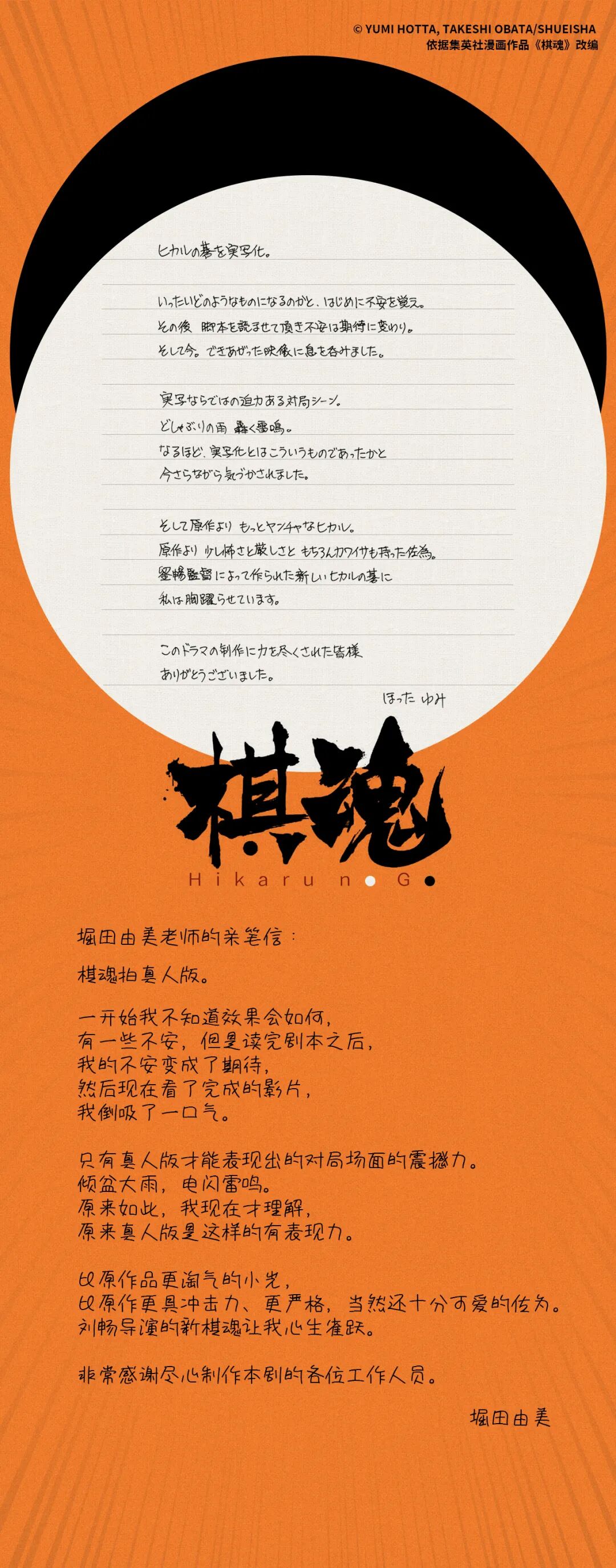 原著(漫画)作者堀田由美寄来了亲笔信,表示自己读完剧本后,心情从“不安”变成了“期待”。