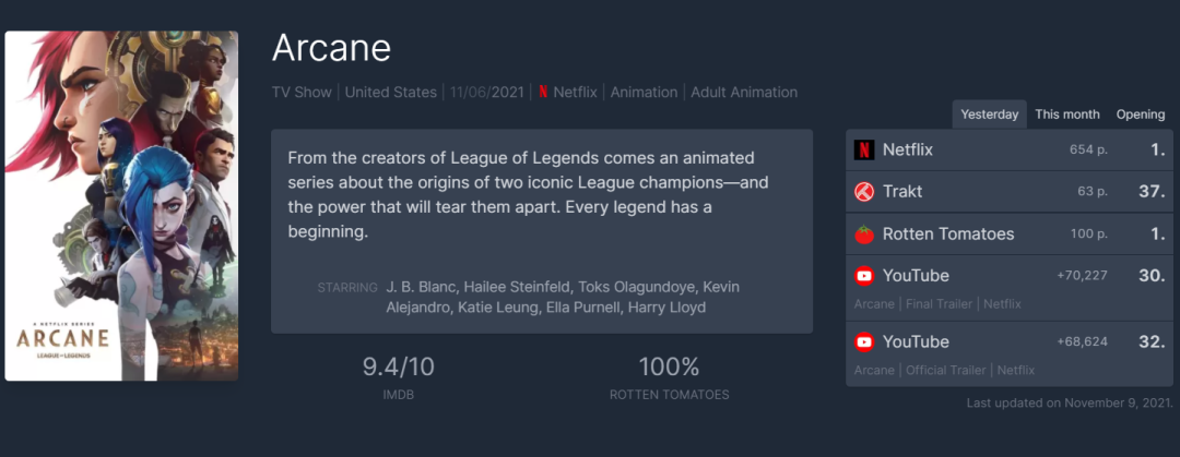 在FlixPatrol的《双城之战》页面,我们可以看到,这部动画获得了IMDb的9.4分高分,以及100%的烂番茄新鲜度。11月8号,《双城之战》更是在Netflix提供服务的38个国家和地区斩获了收视率第一的成绩,在登上全球收视率版单第一的同时,打断了《鱿鱼游戏》在Netflix上连续46天的收视率连冠。
