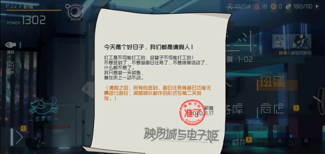 类似这样自相矛盾的设计,在游戏中还有很多。手游玩家面对太“肝”的游戏,都会抱怨玩游戏如上班,每日签到对应打卡,活跃度对应绩效。《映月城》当然保留了这些让它看起来好歹像个手游的东西,但它大胆地提供了一个内置对抗方案,叫做“请假”。