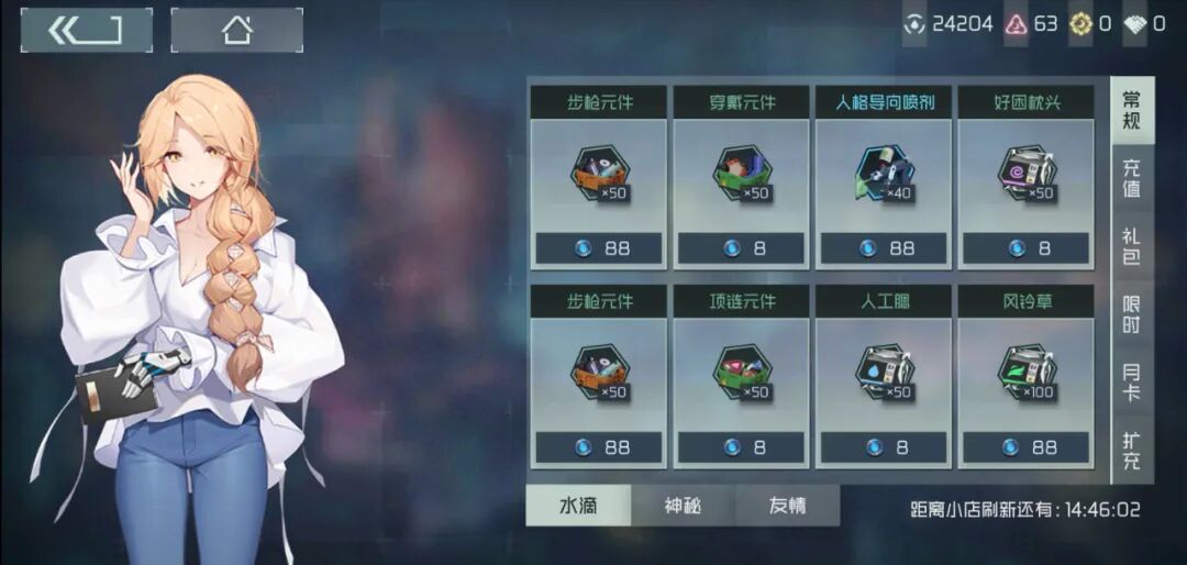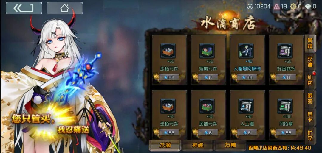 打开游戏商店界面,一股“传奇”气息就扑面而来,简直与那些宣传“屠龙刀,一刀999,点击就送”的广告无异。请回想一下,你正在玩的是一款二次元、二次元游戏!制作组蓄意做出这种风格的商店UI,不看其他玩家评论还真难以知晓所以然。
