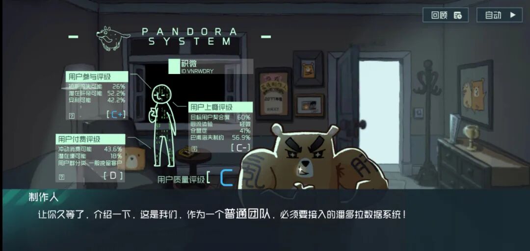 画面上出现了一个玩具熊模样的人,自称是本游戏的制作人,他对我说了几句套话,“我们是一个普通团队”,“我们坚持以不同的方式思考游戏,努力实现创意”之类,随后出门就被另一只熊拿剪刀给杀了,只透过窗户在雷雨天的深夜留下了诡异的影像。也不管我惊魂定是未定,新的熊人进了房间,他不像前面那只,反而心直口快,上来就给我介绍了他们使用的一套智能营销和运营系统——潘多拉系统,这系统只有一个目标:提供每个用户的质量评级。