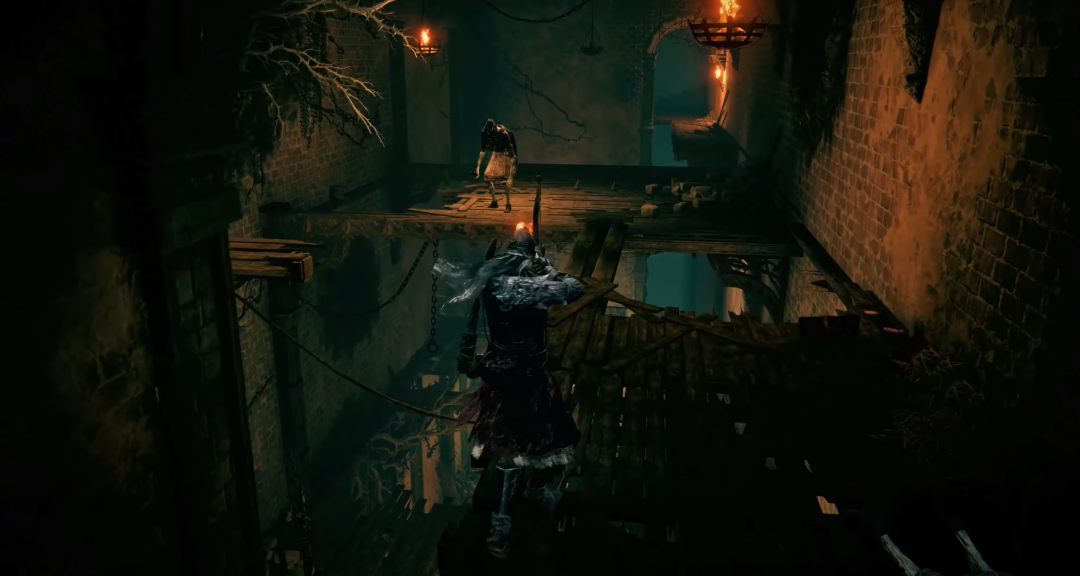 首先,玩家终于可以跳跃了,能比较方便地克服一部分崎岖地形,在城镇内也会经常需要用跳跃解谜。虽然并不能做到像《只狼:影逝二度》那样的蹬墙二段跳,但跳跃手感和《只狼:影逝二度》非常相似,也可以在跳跃到空中时打出攻击,空中攻击有更强的削韧效果。