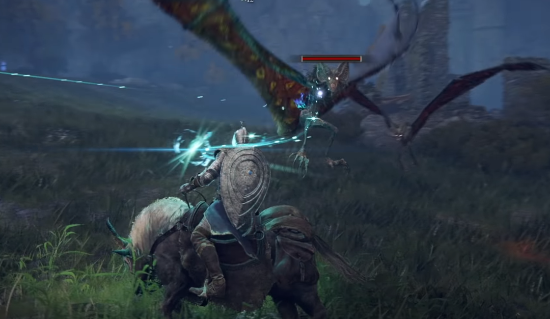 另外,骑马时的玩家探索能力也更强,灵马不仅可以二段跳跨越复杂地形,还可以在地图的特定地点触发“灵魂气流跳跃”,进行大幅度跳跃(而且中途还可以转向),考虑到From Software过去的一些设计,正式版《艾尔登法环》里很可能会有更多垂直空间的探索内容,灵马在这些场合下应该会发挥很大的作用。