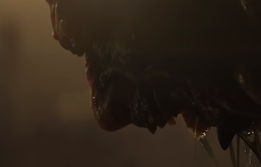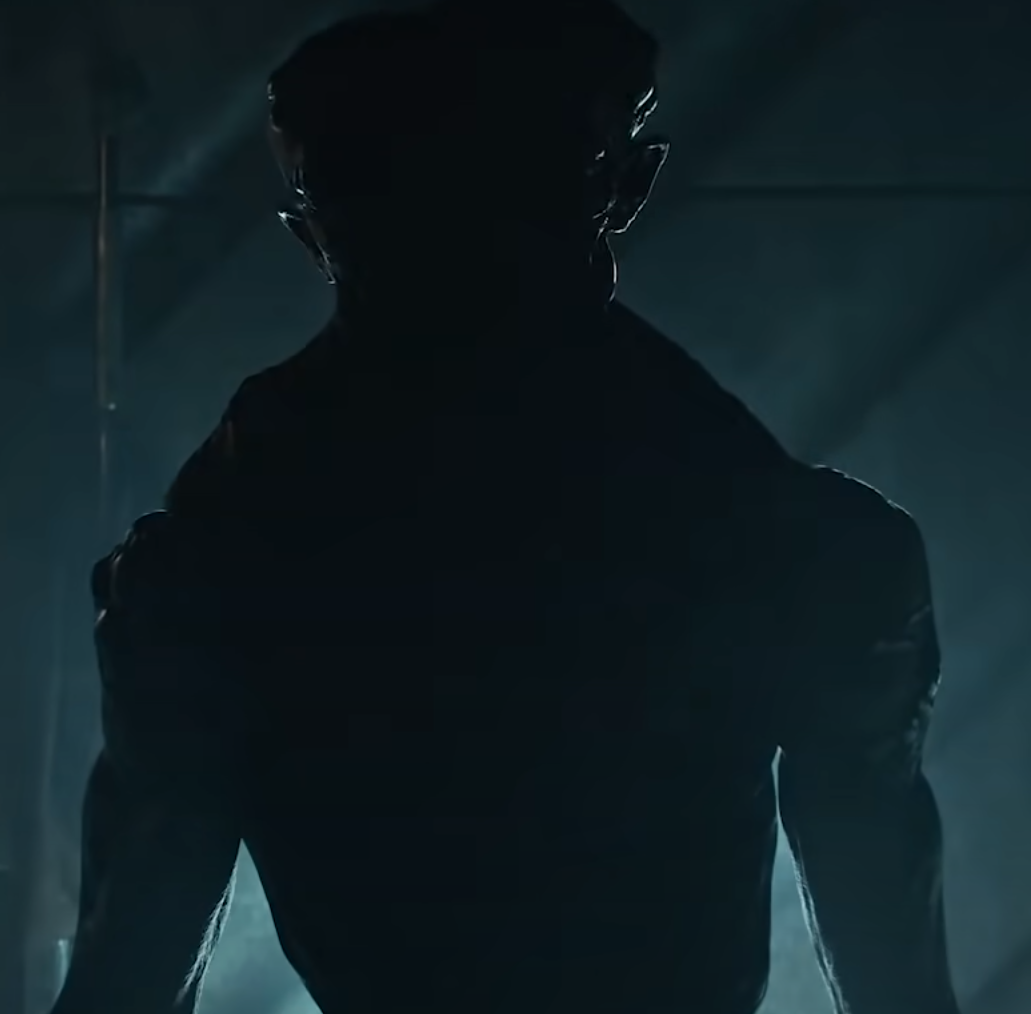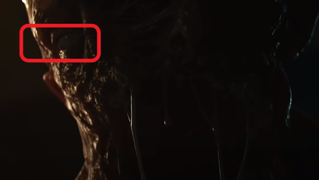 再之后当然就是预告中出现的怪物了,虽然预告片里没有展现它变化的过程,不过很显然这只怪物就是预告主角的狱友,因为不管从外轮廓,还是调亮画面后观察细节,都能看出来这只怪物还保留了一部分人类外形特征。
