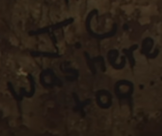 旁边写着“J.C. was here too..”,“J.C.”是《死亡空间3》的双主角之一约翰卡沃尔(John Carver)的简写