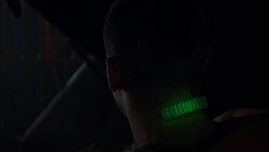 如果你玩过《死亡空间》,你就会发现《木卫四协议》充满了和前者类似的元素。首先当然得是预告片主角脖子后面的这个全息装置,这个装置贴合着角色的颈柱,通过全息投影分出段落式的“格子”。