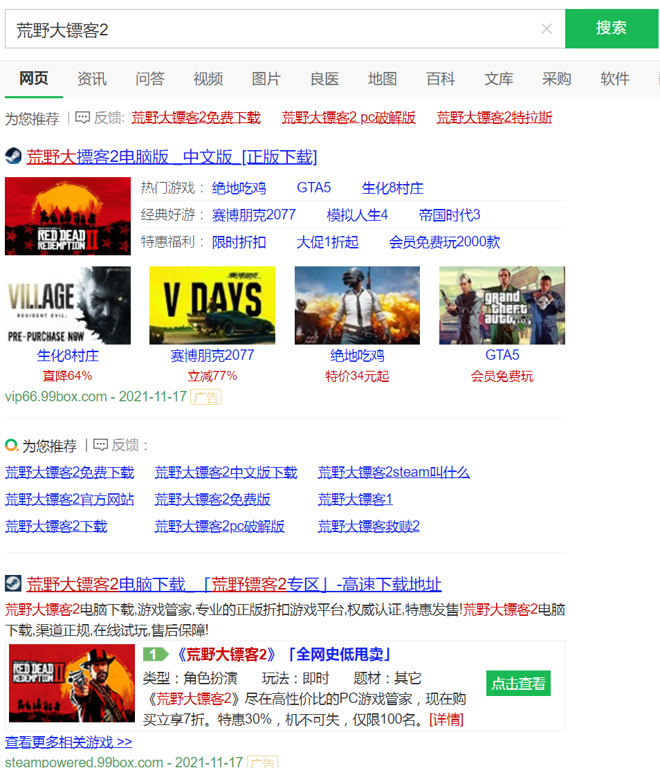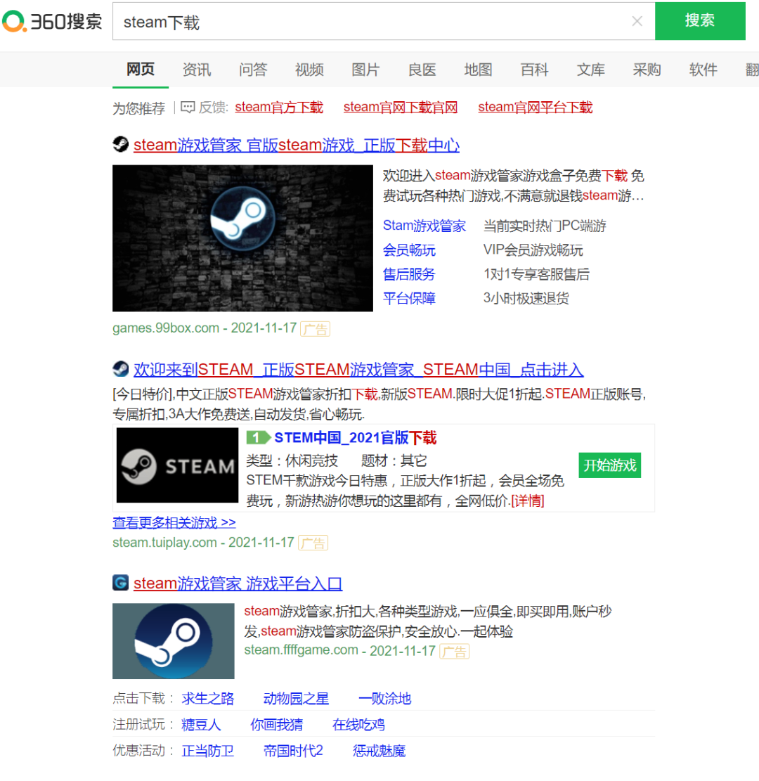 因为即使完美蒸汽平台上线后,现在你在百度360上搜Steam,已会出现真正的Steam地址。但介于中文搜索引擎的广告独特的分发机制,当你搜“Steam下载”或“荒野大镖客”“2077”等国外热门游戏名字时,排前的搜索结果仍然是“假Steam”祖孙们有备案的“正规”平台。