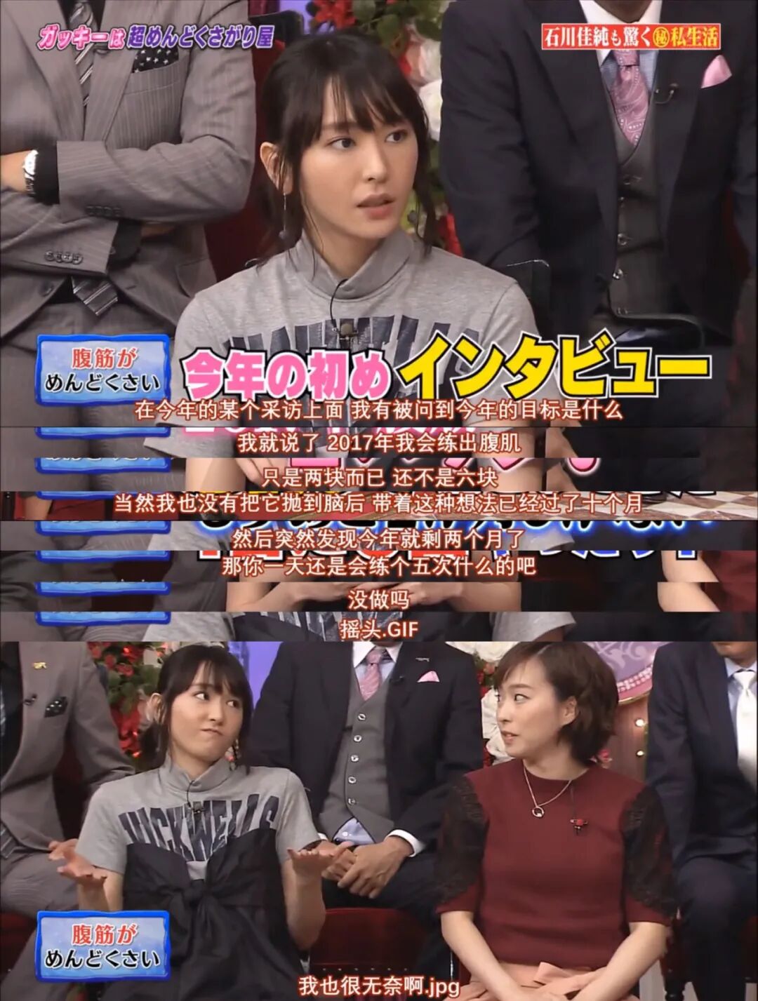 新垣结衣一开始说,我有想要运动,(2017年年初)接受采访的时候,说起2017年的目标是拥有两块腹肌,还只是两块,不是六块喔,但是到了年中的时候,才意识到自己还没开始过,感觉有点愧疚。