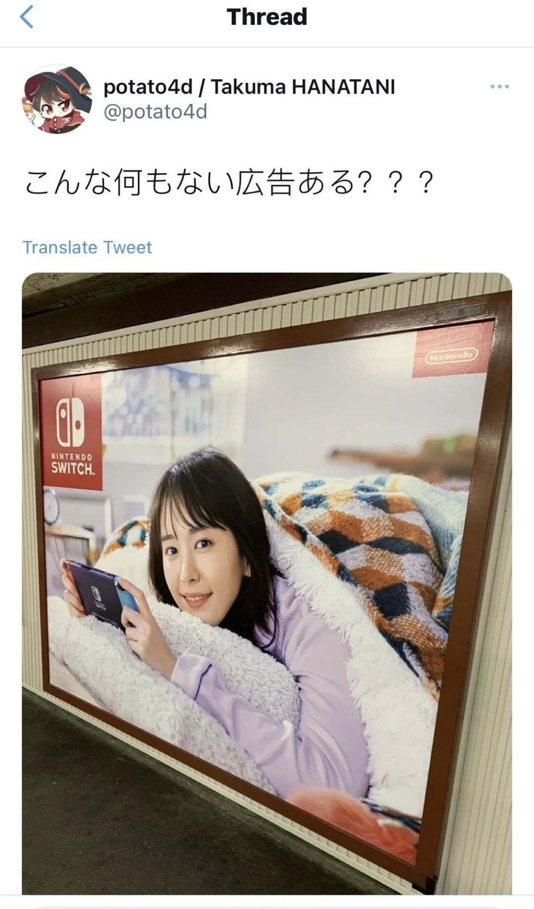有任天堂粉丝总结:Gakki=最强,任天堂=最强,Switch=最强,综合起来就是地表最强。 有人说任天堂大意了,这么一张海报到底想宣传什么的确让人摸不着头脑,没人会去注意到海报上Nintendo的logo,也没人注意到Gakki手上拿的Switch,目光全在Gakki身上,这是Gakki的“大胜利”。 有人做出套娃推理:冬天的被窝,很温暖;在冬天的被窝打Switch,很温暖;看着Gakki在冬天的被窝里打Switch,很温暖;看着广告牌里的gakki在被窝里打Switch,有一种和Gakki共处一室的错觉,很温暖。